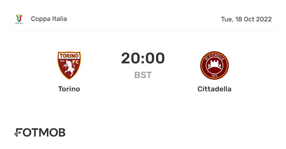 Sign up More details. Torino-Cittadella gara valida per i sedicesimi di finale di Coppa Italia è in programma alle ore 21 allo stadio Olimpico Grande Torino e sarà visibile in esclusiva in diretta sul Canale. Comunica che sono in vendita i tagliandi per la gara di Coppa Italia Frecciarossa Torino vs Cittadella in programma martedì 18 ottobre 2022 alle ore 2100.